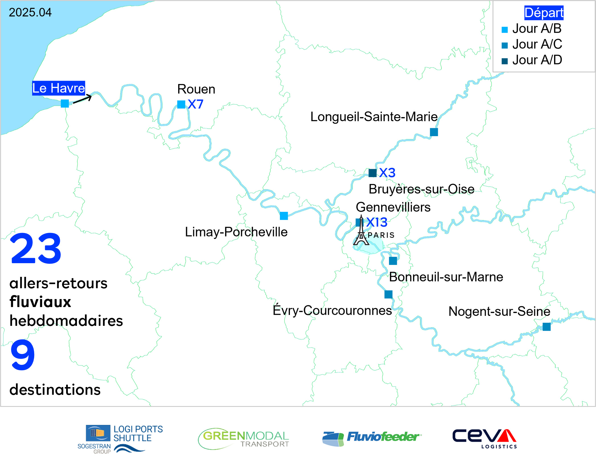 Des premières bornes ont déjà été installées avec VNF, au Havre, à Rouen, Conflans-Sainte-Honorine, Poses-Amfreville et Gennevilliers pour le fret ; et sur les ports de Grenelle, La Tournelle, Boulogne-Legrand, Javel et La Roche Guyon pour la croisière.