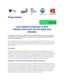 On Wednesday 22 November, HAROPA PORT and VERSO ENERGY signed an agreement for the installation of a plant to produce low-carbon hydrogen and synthetic fuels on HAROPA PORT land in Grand-Quevilly.
