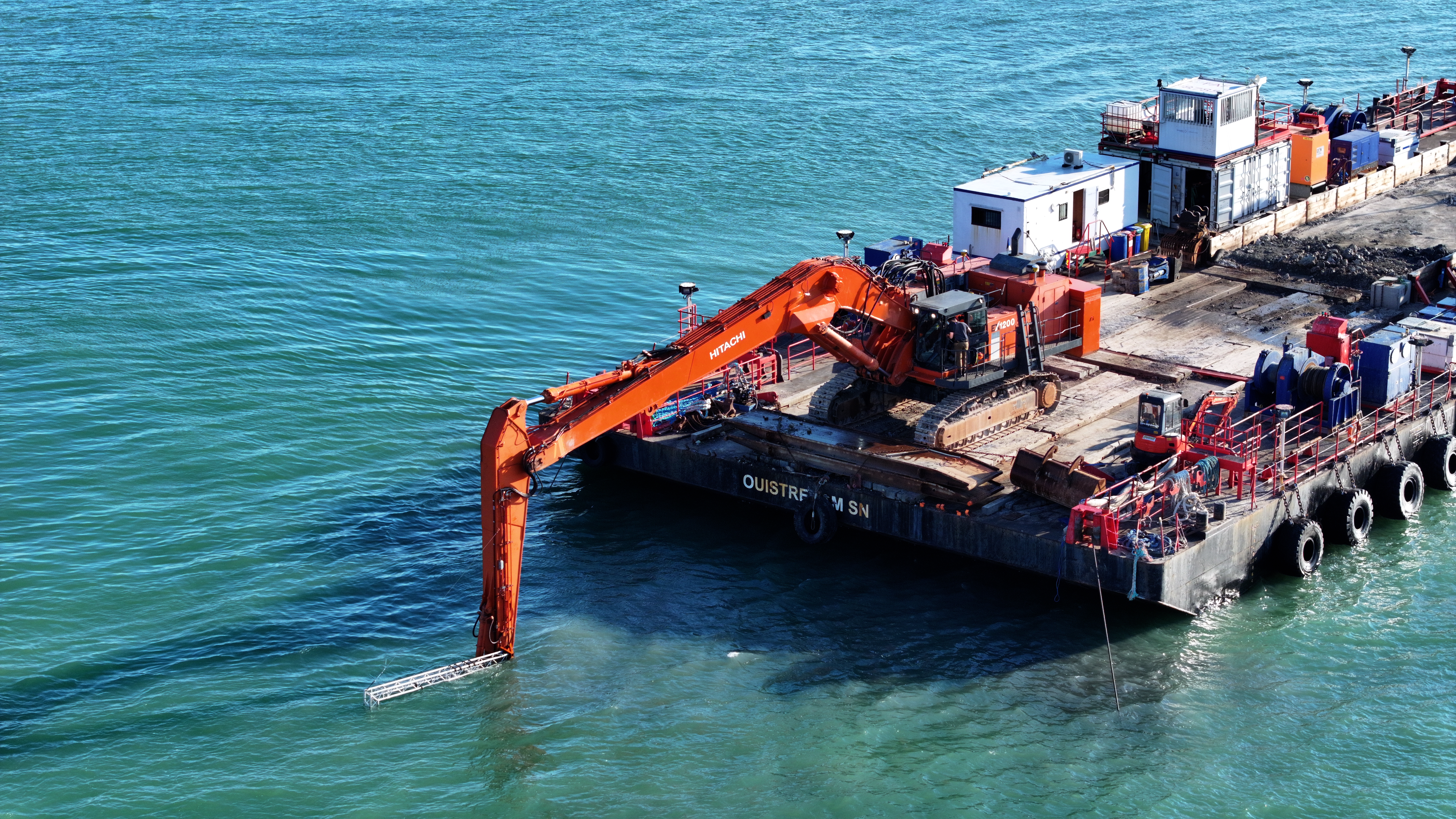 Cette opération permettra au groupement de démarrer la campagne de dragage sur l’emprise de la future digue. La première couche de sédiments ne disposant pas des caractéristiques nécessaires pour supporter le poids de l’ouvrage, un dragage est indispensable.
