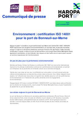 Depuis le jeudi 7 novembre, le port de Bonneuil-sur-Marne est certifié ISO 14001. HAROPA PORT étend ainsi son exigence environnementale à un nouveau site, et pas des moindres, puisqu’il s’agit de la deuxième plateforme portuaire fluviale d’Ile-de-France. Cette nouvelle certification s’ajoute à celles du port de Gennevilliers et du projet Paris Seine Métropole Ouest, également reconduites, et vient attester des moyens et des outils mis en oeuvre pour assurer un service respectueux de l’environnement.