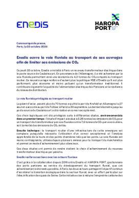 Ce jeudi 03 octobre, Enedis a installé à Paris un nouveau transformateur électrique dans le poste source de Caulaincourt. En provenance de l’Allemagne, il a été acheminé par la voie fluviale permettant ainsi une économie de 4,3 tonnes de C02 comparé au transport routier. Ce nouvel ouvrage renforce d’autant plus la politique RSE d’Enedis qu’il est plus performant, plus économe et moins polluant qu’un transformateur traditionnel. Il contribuera à garantir la qualité de l’alimentation électrique des Parisiens et la résilience du réseau de distribution.