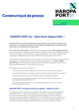 HAROPA PORT vient d’être élu Best Green Seaport 2021 par les lecteurs du magazine Asia Cargo News. La cérémonie des Asian Freight Logistics and Supply Chain Awards (AFLAS) s’est tenue le 21 octobre dernier à Hong Kong.