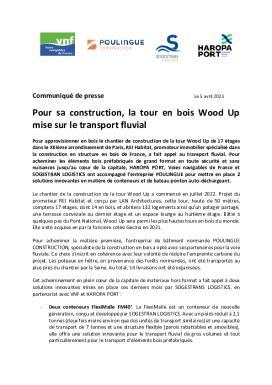 Pour approvisionner en bois le chantier de construction de la tour Wood Up de 17 étages dans le XIIIᵉ arrondissement de Paris, REI Habitat, promoteur immobilier spécialisé dans la construction en structure en bois de France, a fait appel au transport fluvial. Pour acheminer les éléments bois préfabriqués de grand format en toute sécurité et sans nuisances jusqu’au cœur de la capitale, HAROPA PORT, Voies navigables de France et SOGESTRAN LOGISTICS ont accompagné l’entreprise POULINGUE pour mettre en place 2 solutions innovantes en matière de conteneurs et de bateau ponton auto-déchargeant.