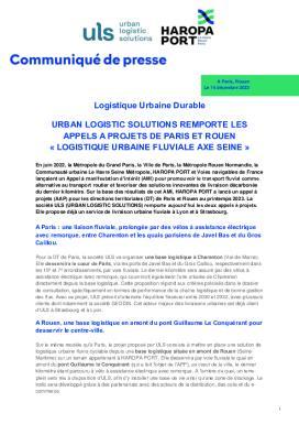En juin 2022, la Métropole du Grand Paris, la Ville de Paris, la Métropole Rouen Normandie, la Communauté urbaine Le Havre Seine Métropole, HAROPA PORT et Voies navigables de France lançaient un Appel à manifestation d’intérêt pour promouvoir le transport fluvial et la livraison décarbonée du dernier kilomètre. Sur la base des résultats de cet AMI, HAROPA PORT a lancé un appel à projets pour les directions territoriales de Paris et Rouen au printemps 2023. La société ULS (URBAN LOGISTIC SOLUTIONS) remporte aujourd’hui les deux appels à projets.
