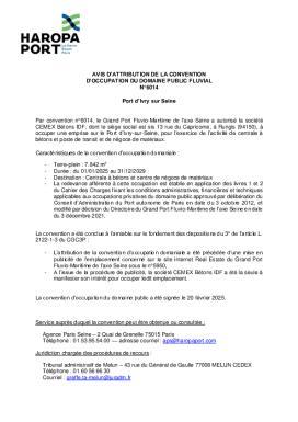 Avis d’attribution des autorisations domaniales : Avis d'attribution de la convention d'occupation du domaine public fluvial n°6014Port d’Ivry sur Seine