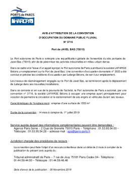 Avis dattribution de la convention doccupation du domaine public fluvial n° 3716 - Port de JAVEL BAS (75015)