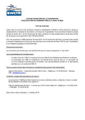 Avis de signature de la convention doccupation du domaine public fluvial n°3669 - Port de Javel bas