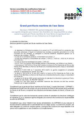 Version consolidée de la Décision n°2025/07 DG portant délégation de signature aux agents désignés pour exercer des fonctions de responsabilité au siège social du grand port fluvio-maritime de l’axe Seine et organisant leur suppléance en cas d’absence ou d’empêchement.